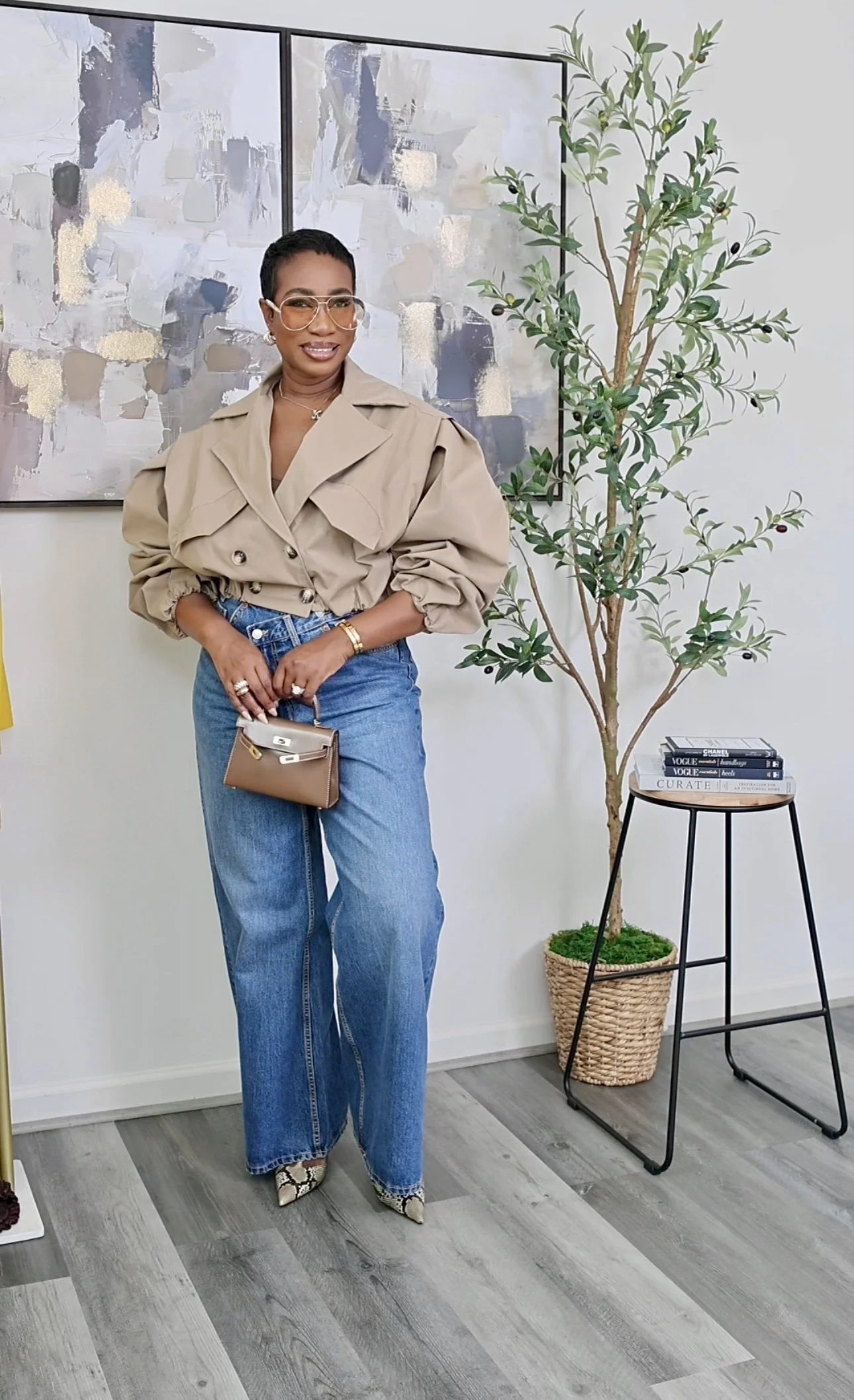 Transitional weather is perfect for trench coats. I styled wide-leg crossover jeans with a cropped trench jacket (in khaki and olive green), snake-print heels, and a brown bag.