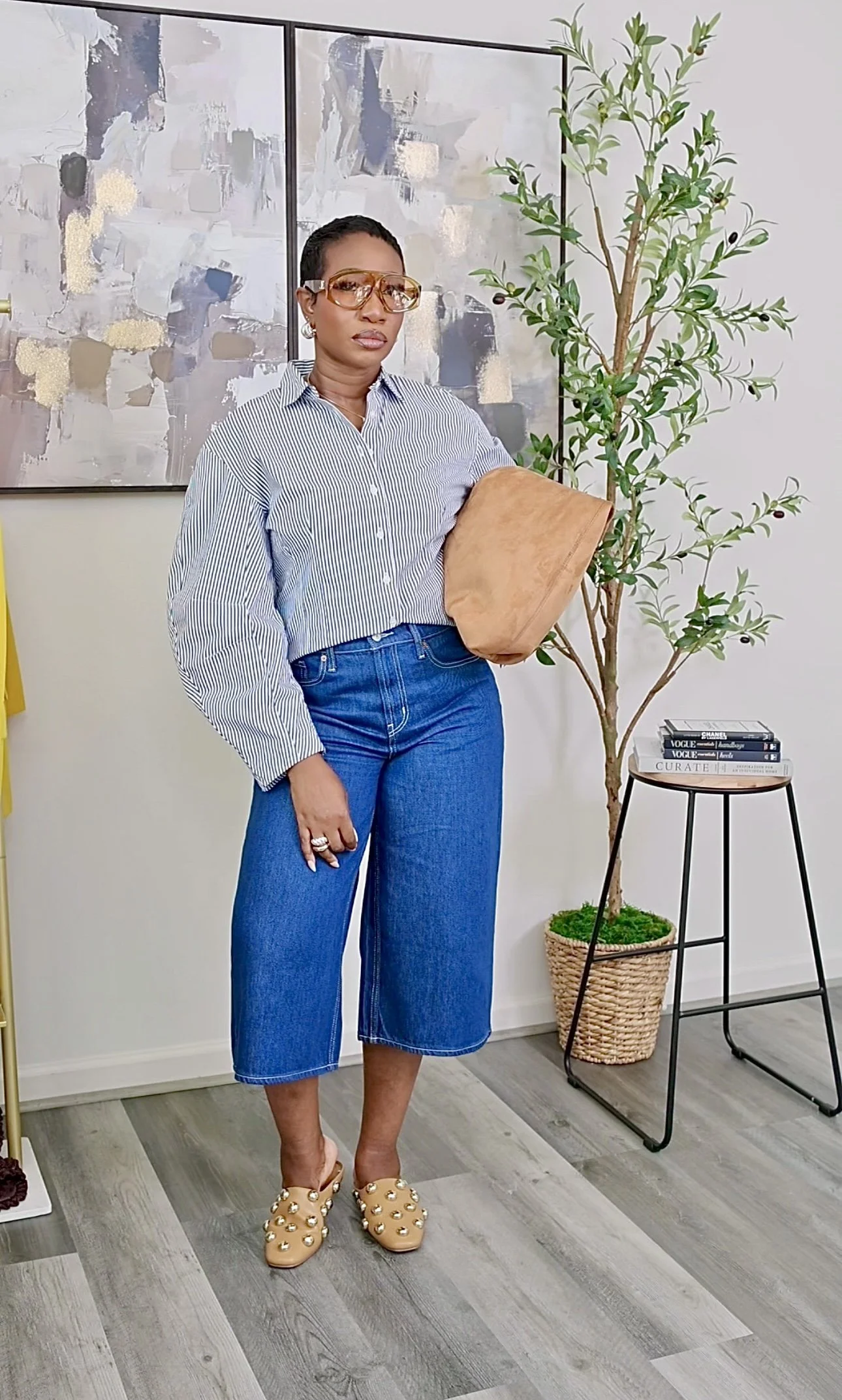 For a more laid-back vibe, I styled a blue-and-white striped barrel-sleeve shirt with denim shorts and brown mules. To finish, I added a slouchy suede bag, another big fall trend.