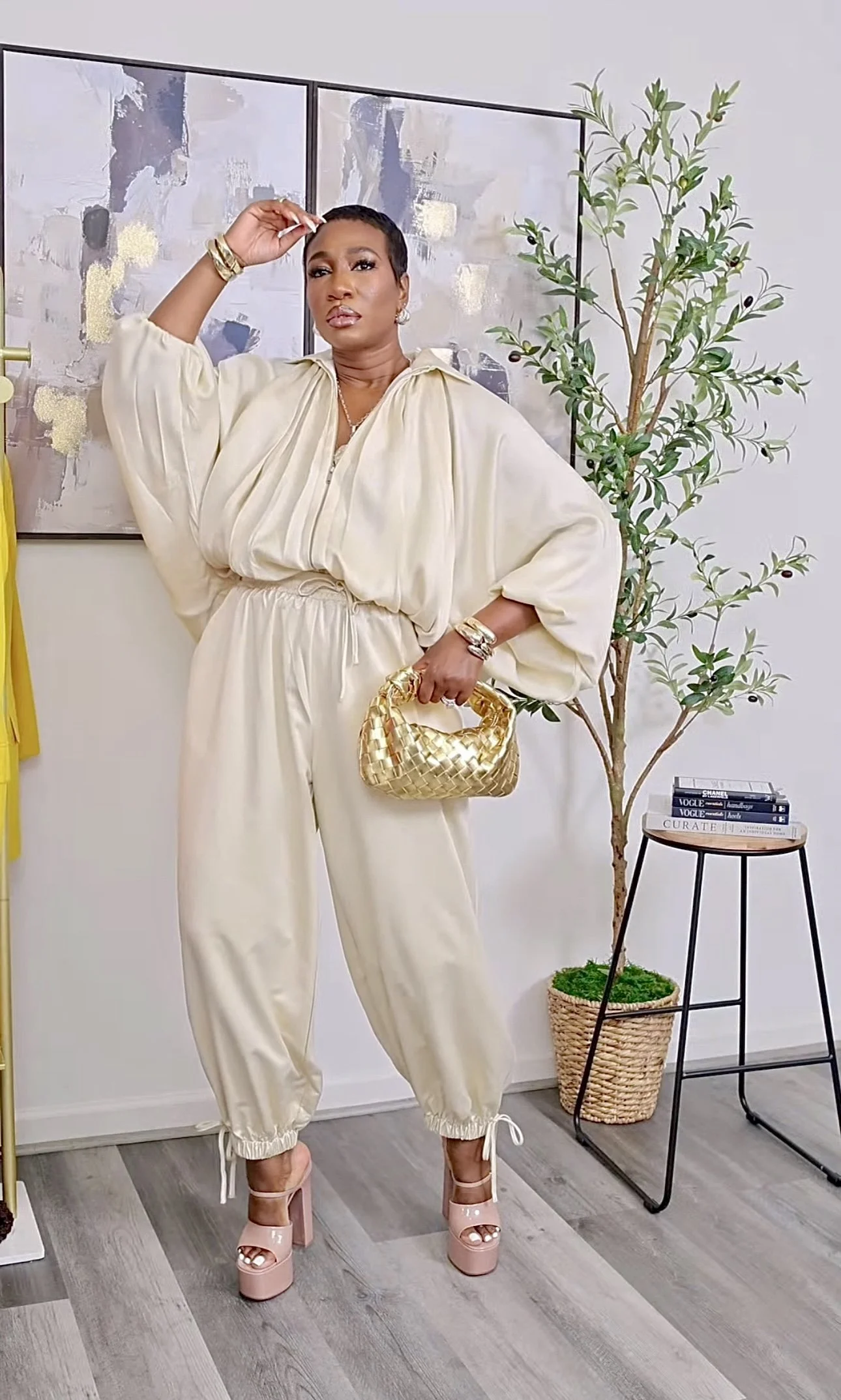 To end strong, I styled cream balloon pants with a lightweight bubble jacket, platform heels, and a gold bag for a sleek monochrome finish.
